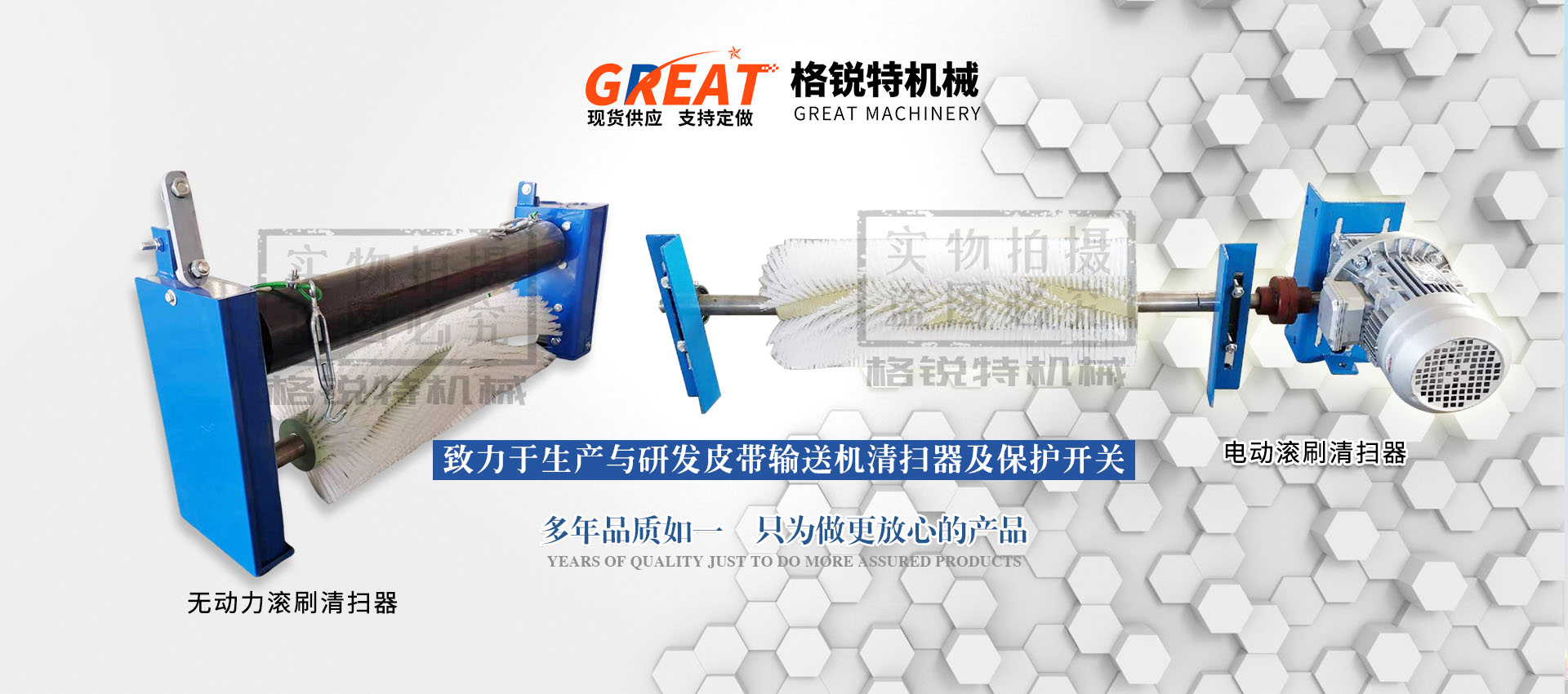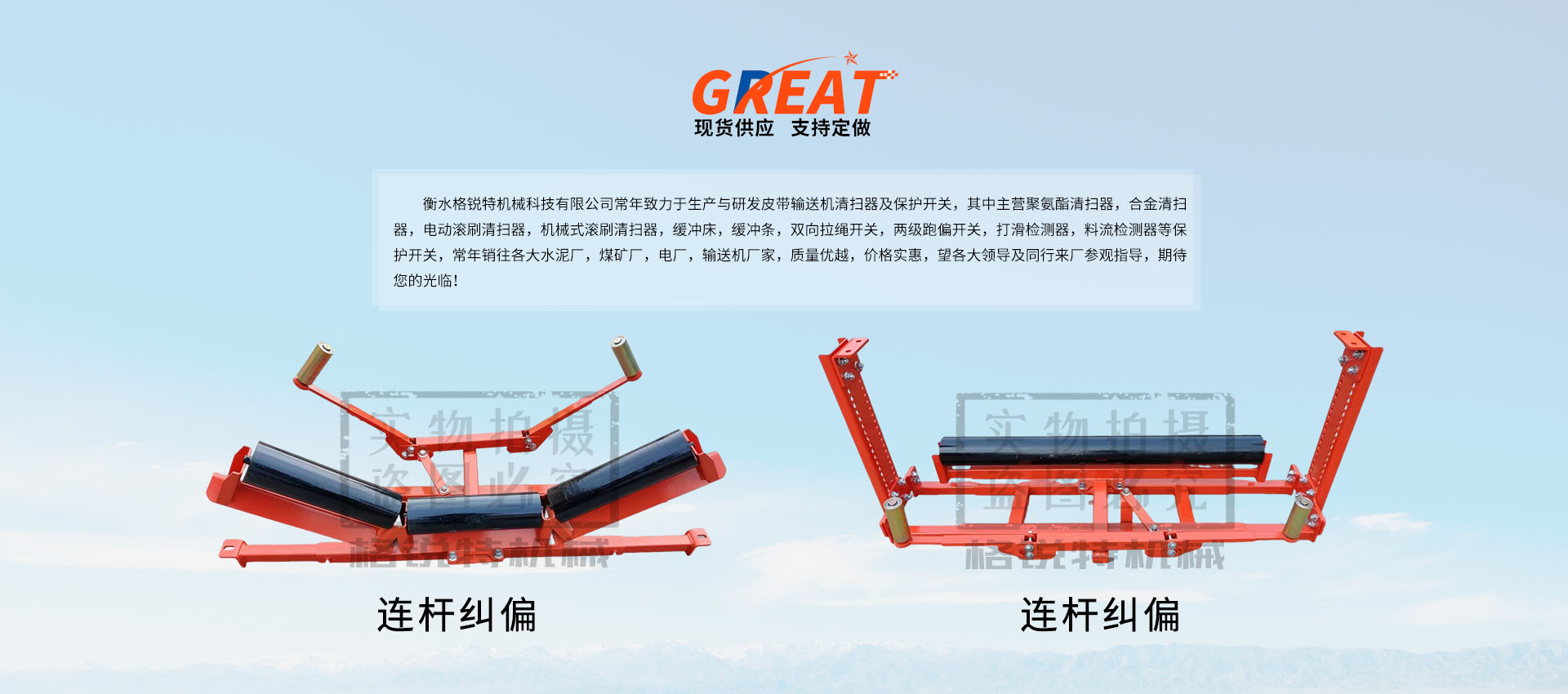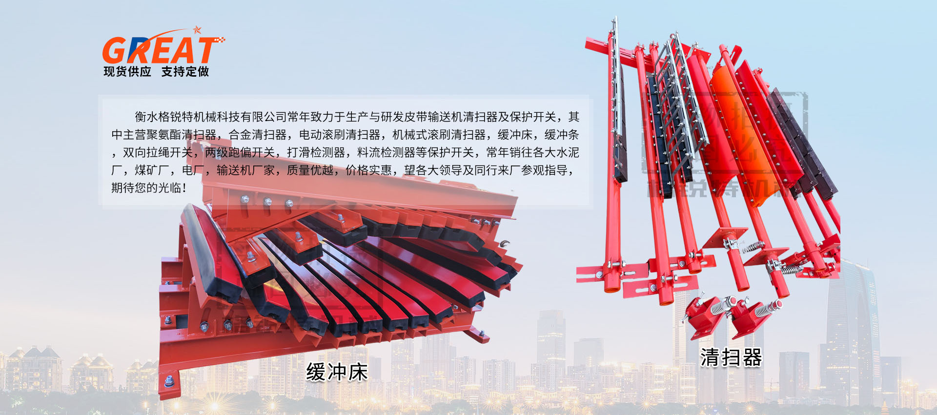 衡水格銳特機(jī)械科技有限公司常年致力于生產(chǎn)與研發(fā)皮帶輸送機(jī)清掃器及保護(hù)開(kāi)關(guān),其中主營(yíng)聚氨酯清掃器,合金清掃器,電動(dòng)滾刷清掃器,機(jī)械式滾刷清掃器,緩沖床,緩沖條,雙向拉繩開(kāi)關(guān),兩級(jí)跑偏開(kāi)關(guān),打滑檢測(cè)器,料流檢測(cè)器等保護(hù)開(kāi)關(guān),常年銷(xiāo)往各大水泥廠(chǎng),煤礦廠(chǎng),電廠(chǎng),輸送機(jī)廠(chǎng)家,質(zhì)量?jī)?yōu)越,價(jià)格實(shí)惠,望各大領(lǐng)導(dǎo)及同行來(lái)廠(chǎng)參觀指導(dǎo),期待您的光臨?。?!